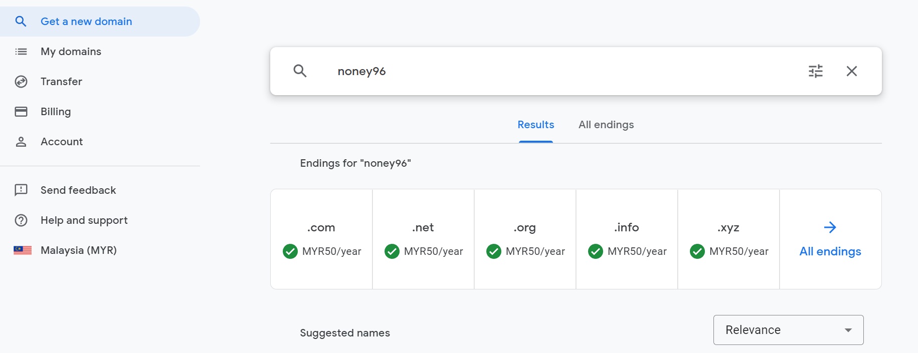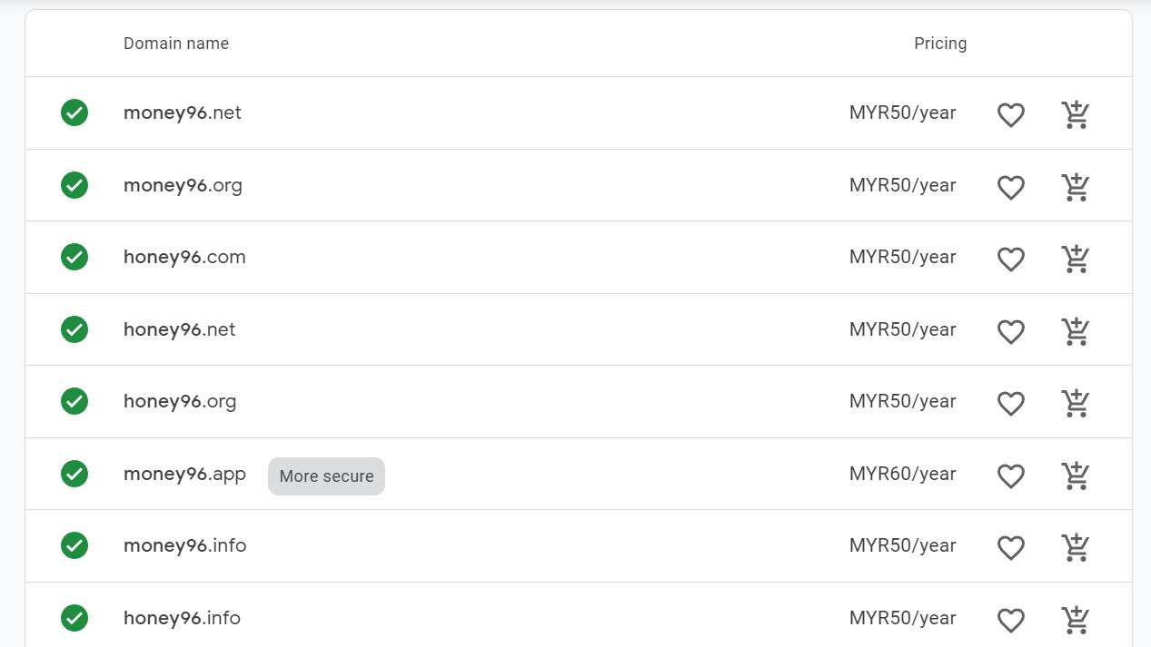- Cari nama domain yang anda ingin beli dengan alat carian Google Domains. Domain Google menyokong pelbagai peluasan domain, termasuk .net, .org, .co, dan .social. Anda akan melihat ketersediaan domain yang anda pilih, dan pelbagai jenis nama domain yang serupa.