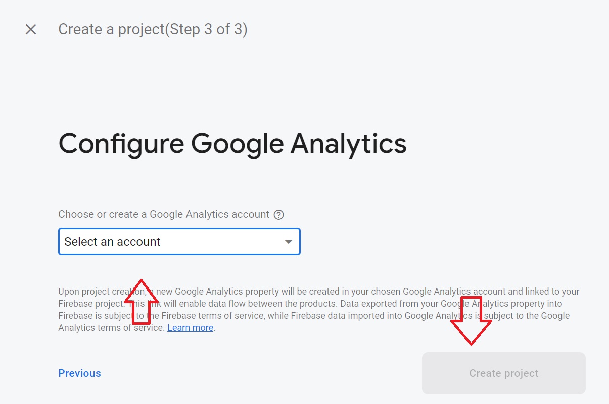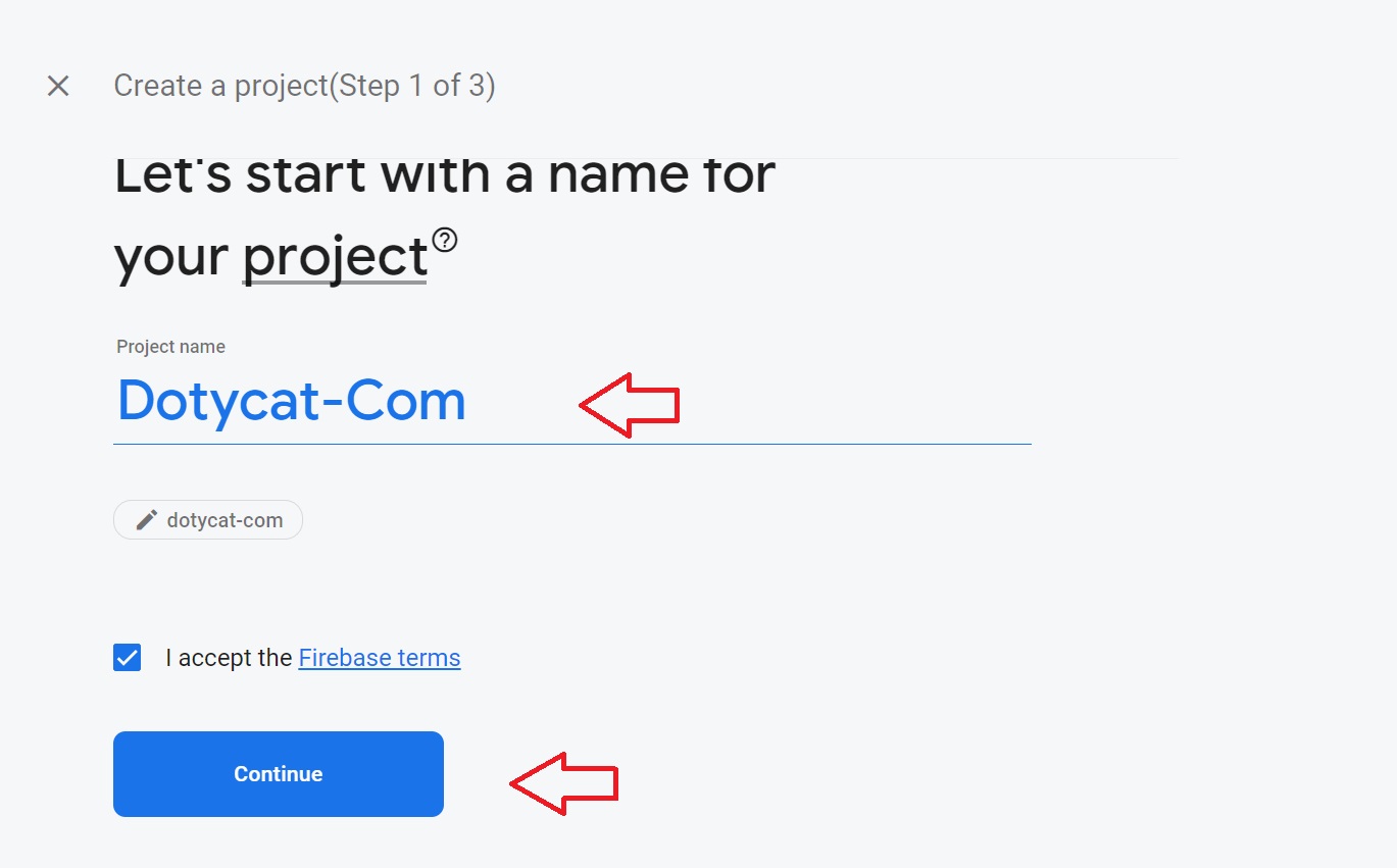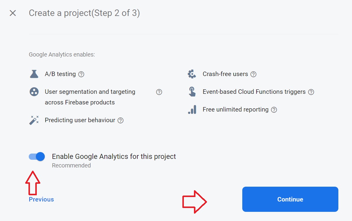- Buat nama projek Konfigurasikan Google Analytics (boleh pilih Bukan Sekarang) Terus. Tunggu sehingga pembuatan projek anda selesai, kemudian klik Lanjutkan.