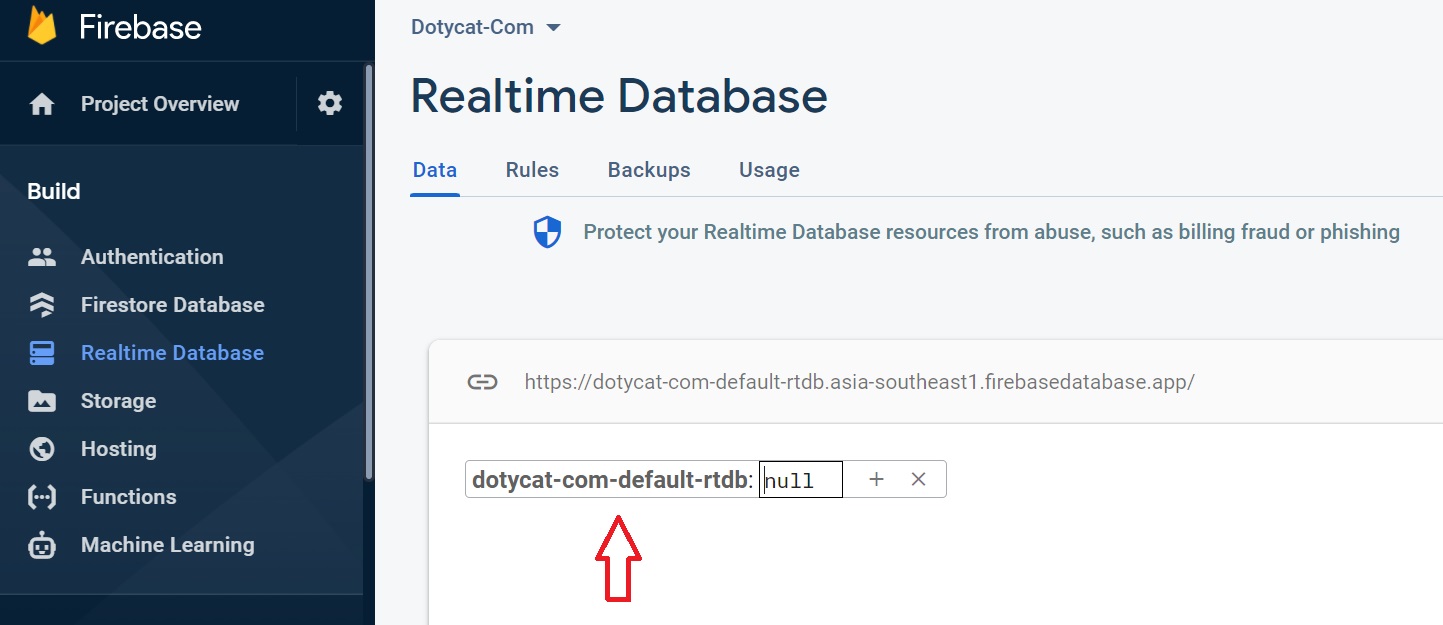 - Tumpukan pada code yang saya tandakan dotycat-com-default-rtdb gantikan dengan id firebase anda yang anda simpan dalam step di atas.