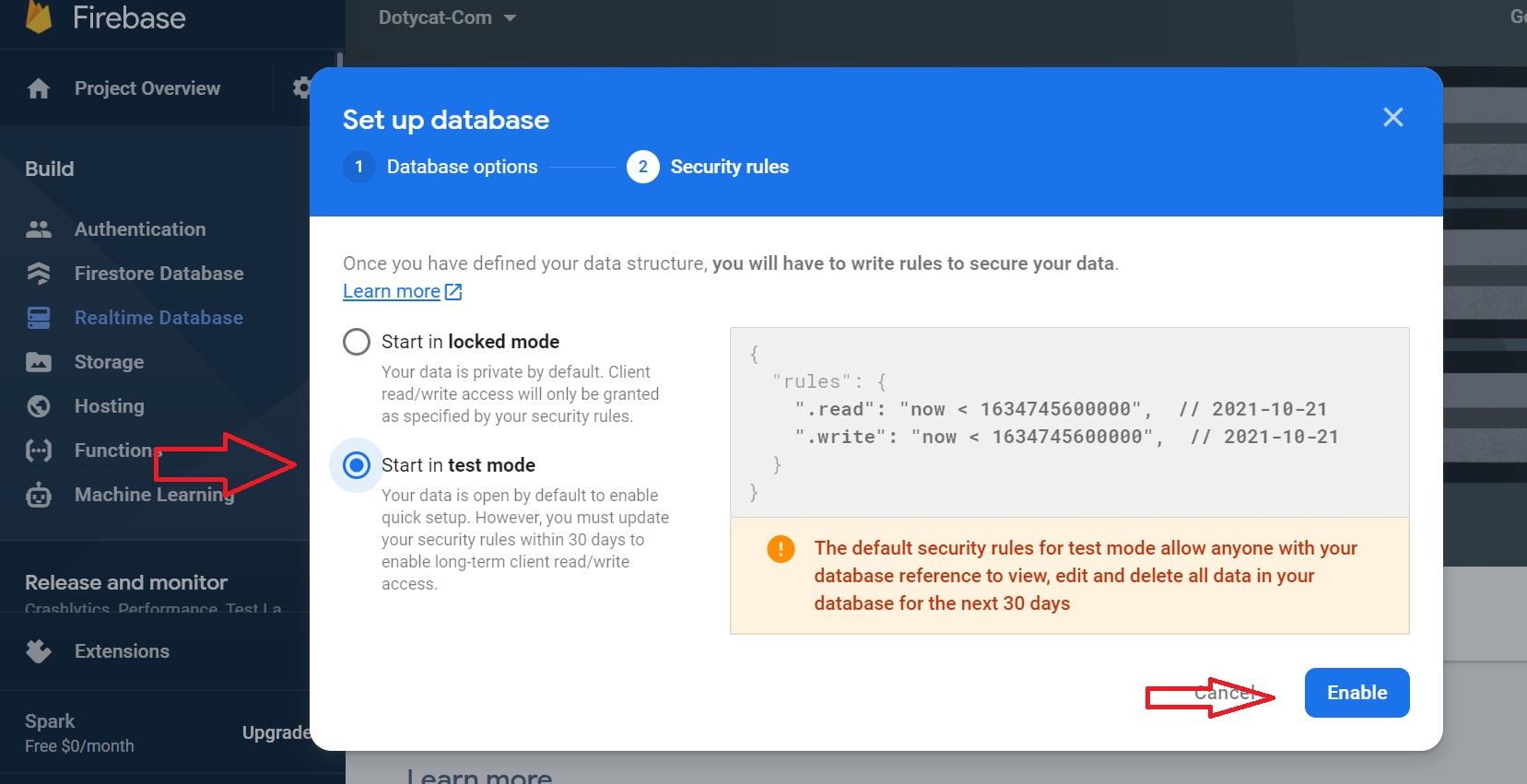 - Di bawah tetapan keselamatan untuk Pangkalan Realtime pilih test mod kemudian klik Aktifkan (lihat contoh gambar di bawah).