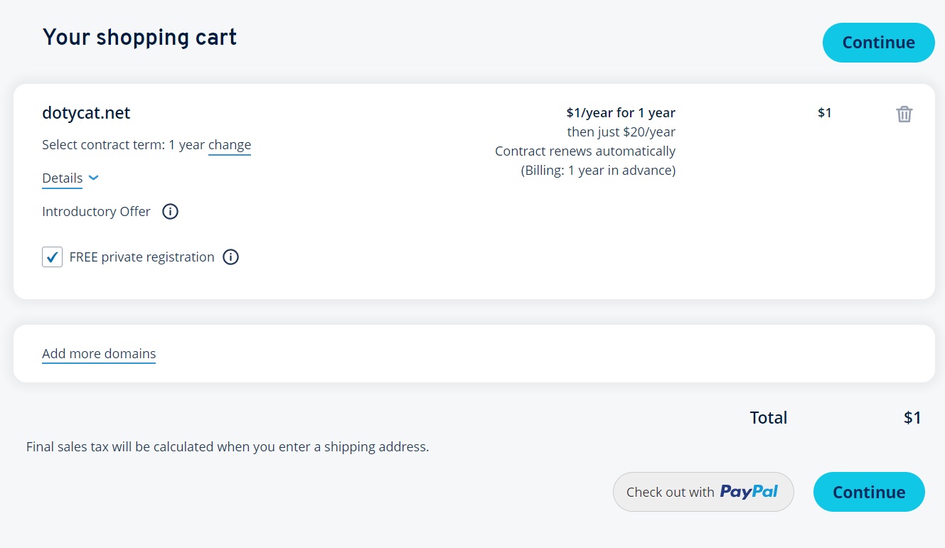 - Selanjutnya anda akan nampak subtotal ataupun harga total untuk 1 domain (cek gambar cik adik manis) Dn tekan butang Continue